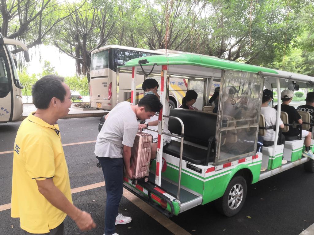 辅导员老师为员工搬行李乘坐校园巴士返宿舍
