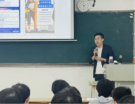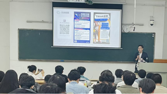 宣讲会上,翰略传媒科技项目负责人庄凯伟先生结合自身丰富的金融与电商创业经历,向同学们介绍了公司背景及跨境电商的广阔前景。他指出,在当前国内市场竞争激烈、消费降级的背景下,跨境电商正成为国家政策支持、市场空间巨大的新蓝海。他以TikTok Shop、TEMU等平台为例,详细分析了不同模式的运营逻辑、投入成本与发展潜力,并展示了多个实战店铺的运营数据,生动说明了跨境电商在年轻创业者中的可行性与回报空间。